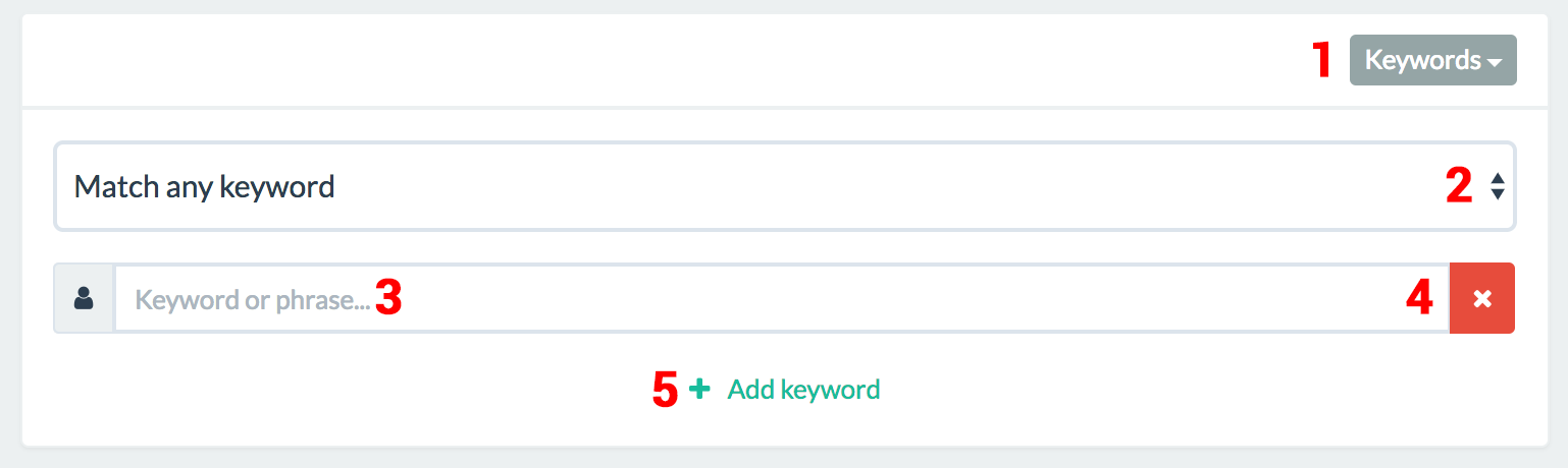 Match defined keywords against user input. Can match any (OR) or all (AND) defined keywords. Texts before matching will be converted to lowercase.