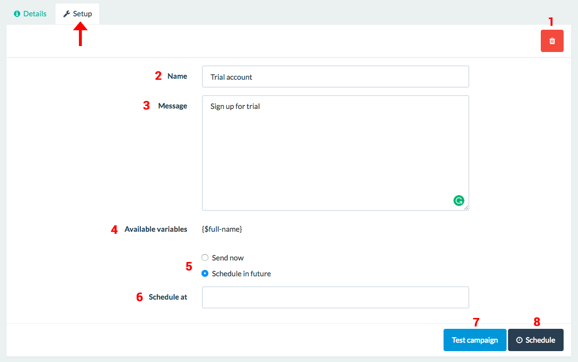 In order to test campaign, you need to click button (7) and then test window will appear.